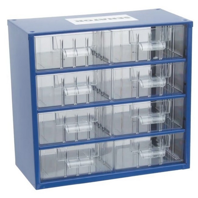 Experience the difference today with a robust eight-drawer parts organiser crafted from heavy-gauge steel with a durable painted blue finish, designed to deliver long-term performance in demanding industrial and maintenance environments. The compact cabinet measures 306 mm wide, 155 mm deep and 282 mm high, making it ideal for bench-top use, shelving or secure wall mounting, and its stackable design permits vertical expansion to maximise limited floor space. Each drawer is moulded from hard-wearing transparent polypropylene, giving instant visibility of contents without opening and reducing retrieval times; drawers measure 140 x 140 x 59 mm and include a rear lip to allow full extension without risk of items spilling. The robust construction withstands frequent handling, stacking and transport while maintaining structural integrity, and integrated label holders simplify identification and restocking to prevent wasted time and duplicate purchases. Practical for small electrical components, fixings, seals, office supplies and workshop consumables, this organiser supports efficient workflows by keeping commonly used parts organised and accessible where they are needed most. The clear drawer faces make inventory checks quick and unobtrusive, enabling teams to monitor stock levels and reorder proactively, and the smooth drawer action ensures fast access even when drawers are fully loaded. Installation and reconfiguration are straightforward, allowing businesses to tailor storage layouts to changing demands and to combine multiple units into a cohesive system. It pairs easily with shelving and internal dividers to create a tailored inventory strategy, and its wipe-clean painted finish resists grime to keep the unit presentable. Whether used on a service vehicle, in a parts room or by the production line, it improves accountability, supports audits and cuts emergency orders. It represents a modest investment that delivers measurable returns in productivity and orderliness for workshops, maintenance departments and parts rooms seeking a compact, professional solution for small items storage.